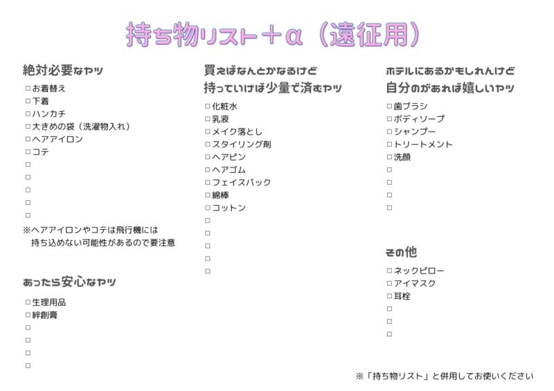 コンタクトや、メイク道具など必要なものがあれば書き足して使ってください。
